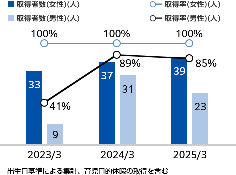 働きやすい環境づくりを積極的に取り組んでいます。育児休業取得はもちろん、普段の就業時も1か月の平均残業時間は10時間を切るなど、育児休業の前後もむりなく働くことができます。近年では特に男性の育児休業・育児目的休暇の取得推進活動を行っており、取得率が大きく改善しています。