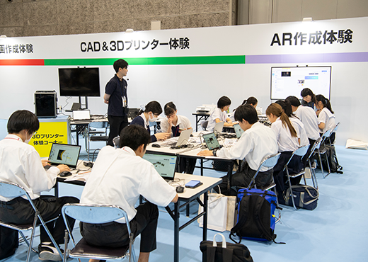 最新のICTやAIを活用した「合成動画作成」「3Dプリンター造形」「拡張現実(AR)コンテンツ作成」「ドローン制御」などSTEAM教育の実践の場として体験コーナーも会場内へ設置。