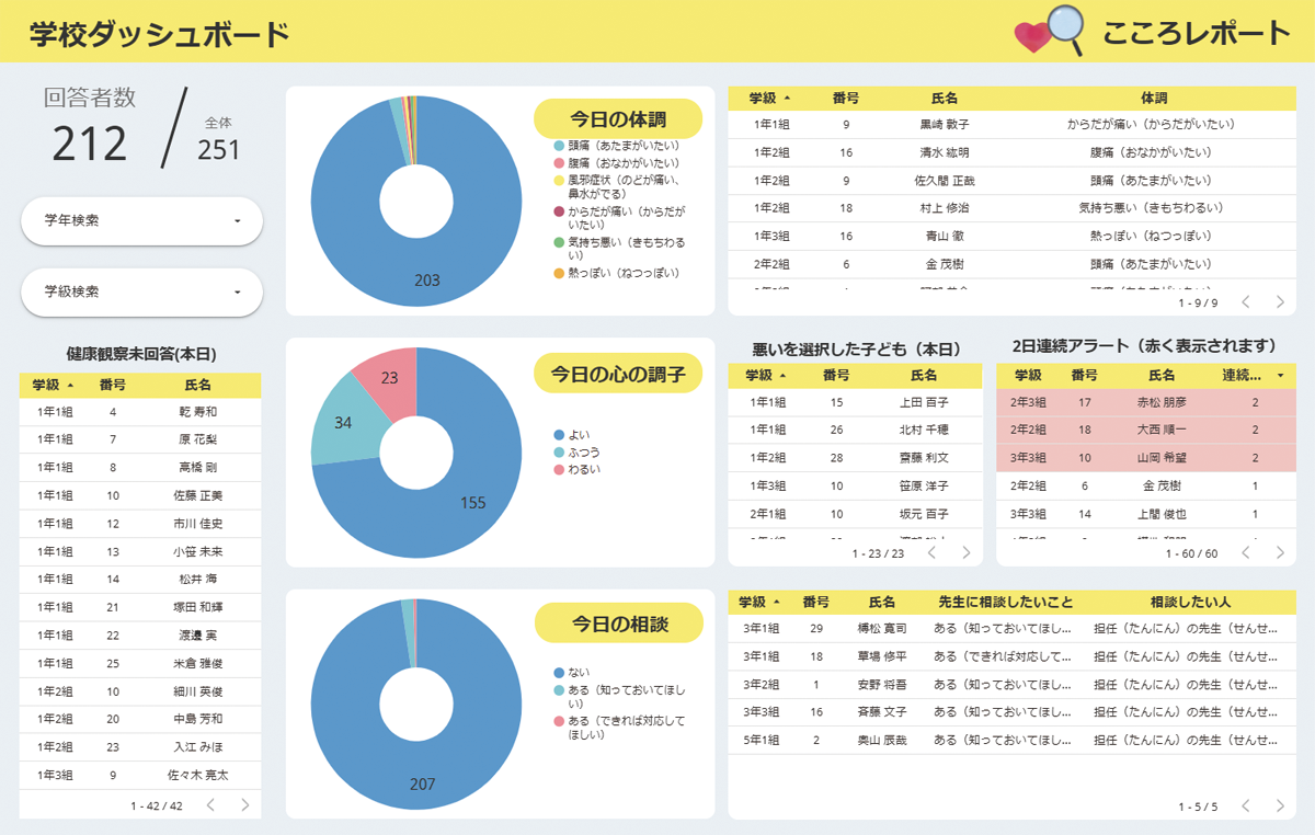 児童生徒の体調や心の調子などを把握できるこころレポート。 -