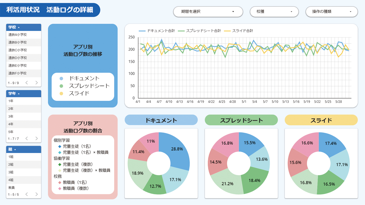 利活用状況ダッシュボードでは、Google Workspace for Education の各アプリのログデータを基に、「個別学習」「協働学習」「校務」を独自に定義。利活用状況を場面ごとに分析・可視化する。