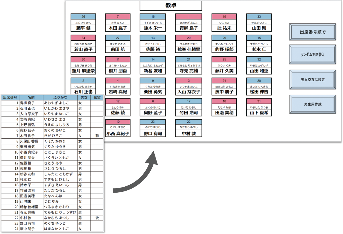 Google スプレッドシートに入力された名簿情報を基に席替え案を作成してくれる。 -