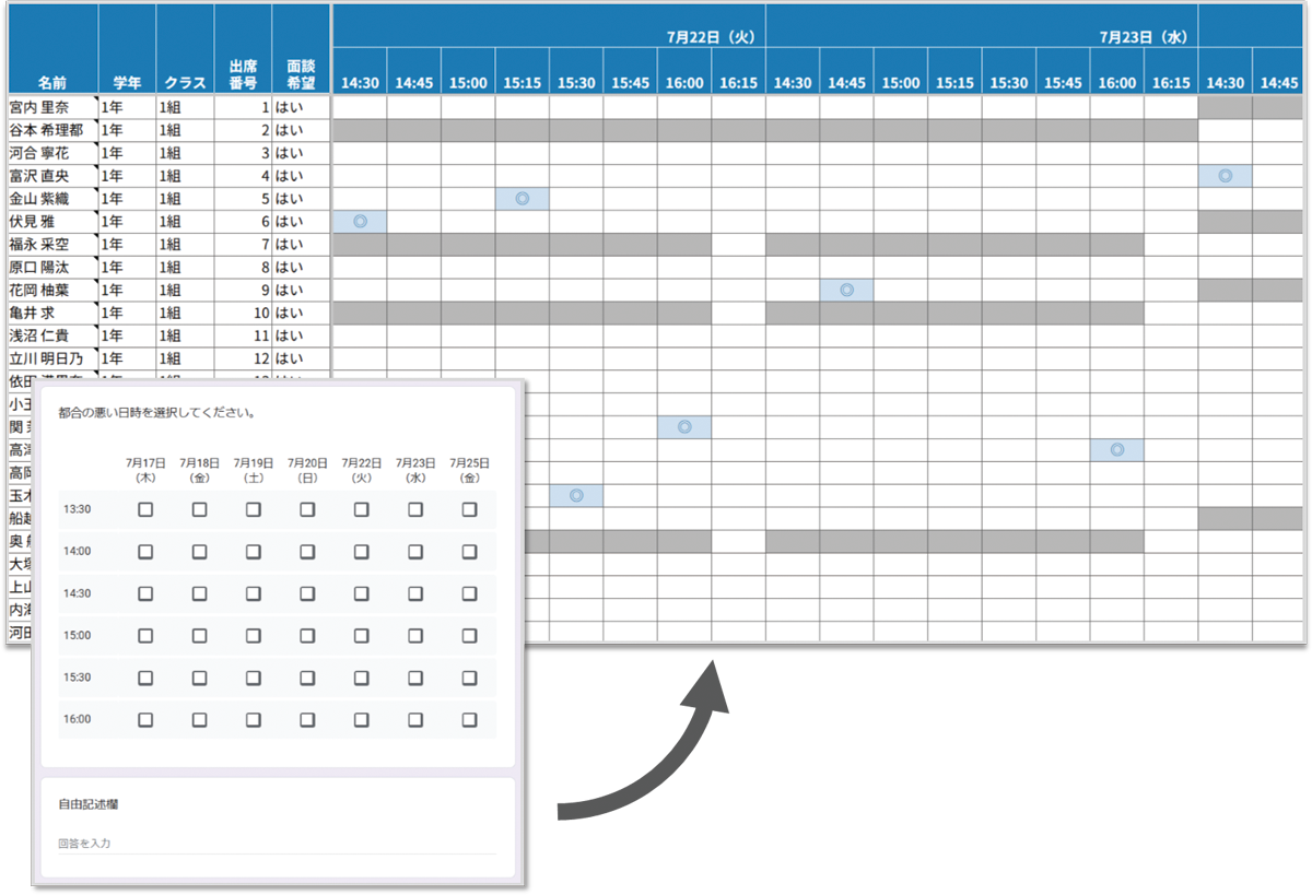 フォームに回答された内容を基に、面談のスケジュールを自動調整し、提案する。さらに保護者へのお便り作成まで対応している。