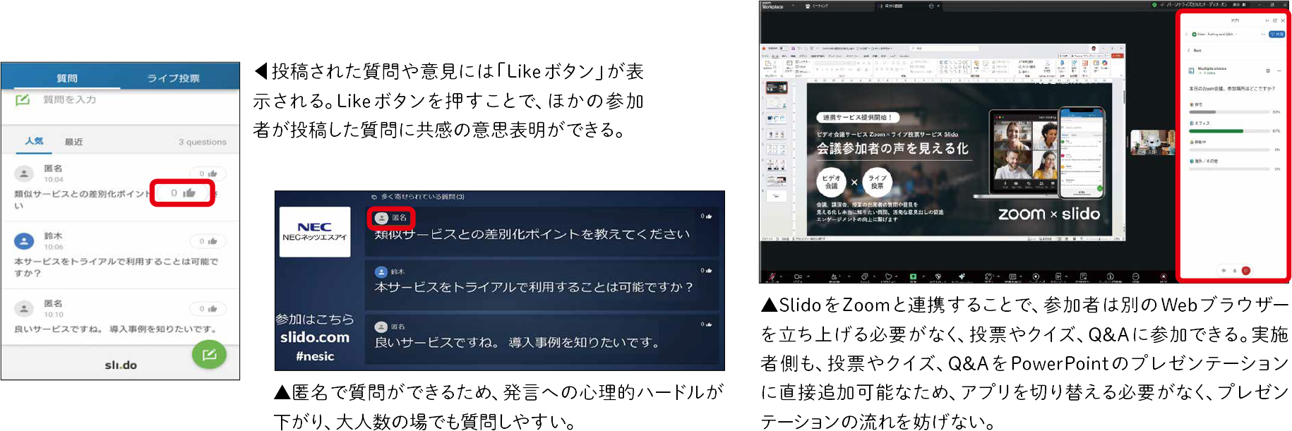 ※SlidoはCisco Systems, Inc.のサービスです。 ※slidoはCisco Technology, Inc.の商標または登録商標です。 ※ZoomはZoom Communications, Inc.のサービスです。