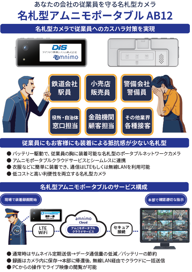 ダイワボウ情報システム株式会社 (本社:大阪市北区/東京都港区、代表取締役社長:松本 裕之、以下DIS)は、この度アムニモ株式会社(本社:東京都武蔵野市、代表取締役社長:小嶋修、以下アムニモ)と連携し、2026年よりカスタマーハラスメント(以下カスハラ)対策が義務化されることを見据え、カスハラ対策に特化した名札型カメラ(AB12)と映像を管理するクラウドサービスの提供を開始します。